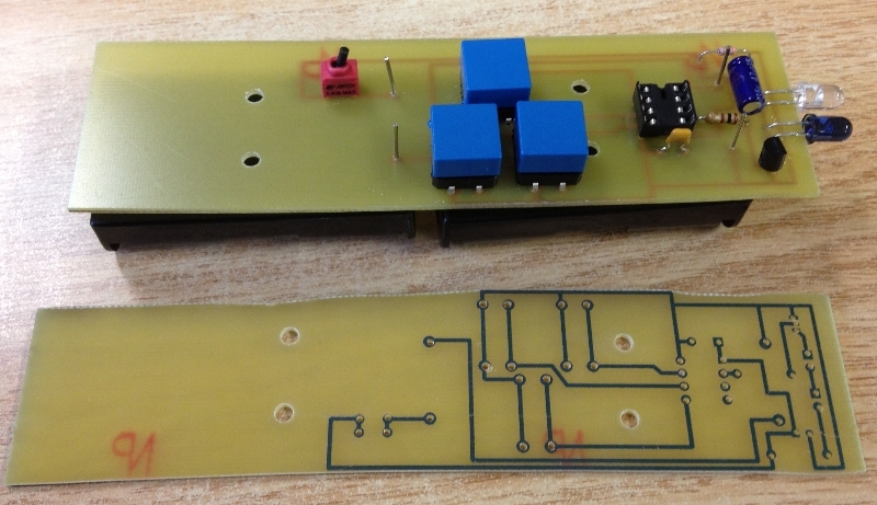 I began by using ExpressSCH to lay out a schematic of the circuit required to power the microprocessor and LEDs. I used I then used Google SketchUp to create a mocked up 3D model of the remotes appearance. Using ExpressPCB, I then arranged the parts in a real world design that would fit the mock up. I calculated all the required values for parts, such as resistance for the resistors, and current for the LEDs, then ordered them from Digikey.com. I then used circuit board coated with photosensitive chemicals to print my circuit onto the board, through a multi-step chemical process. After cutting the board down to size, I soldered all the parts in.